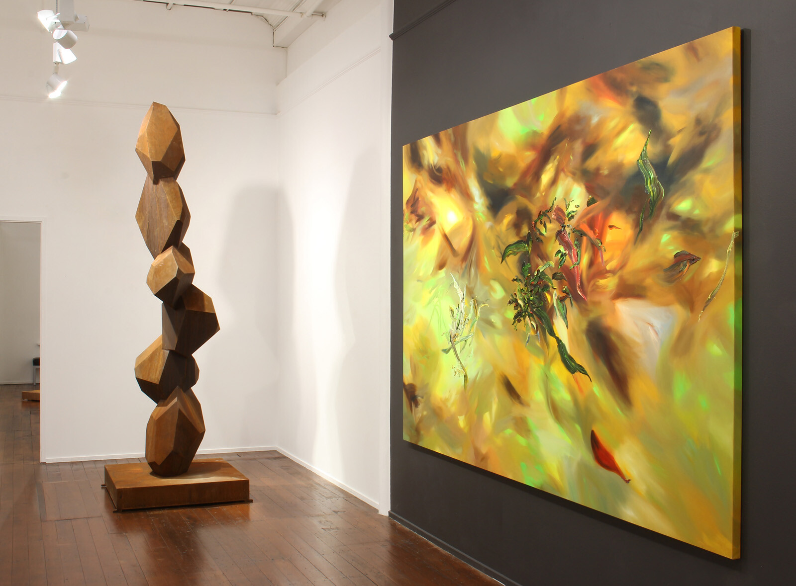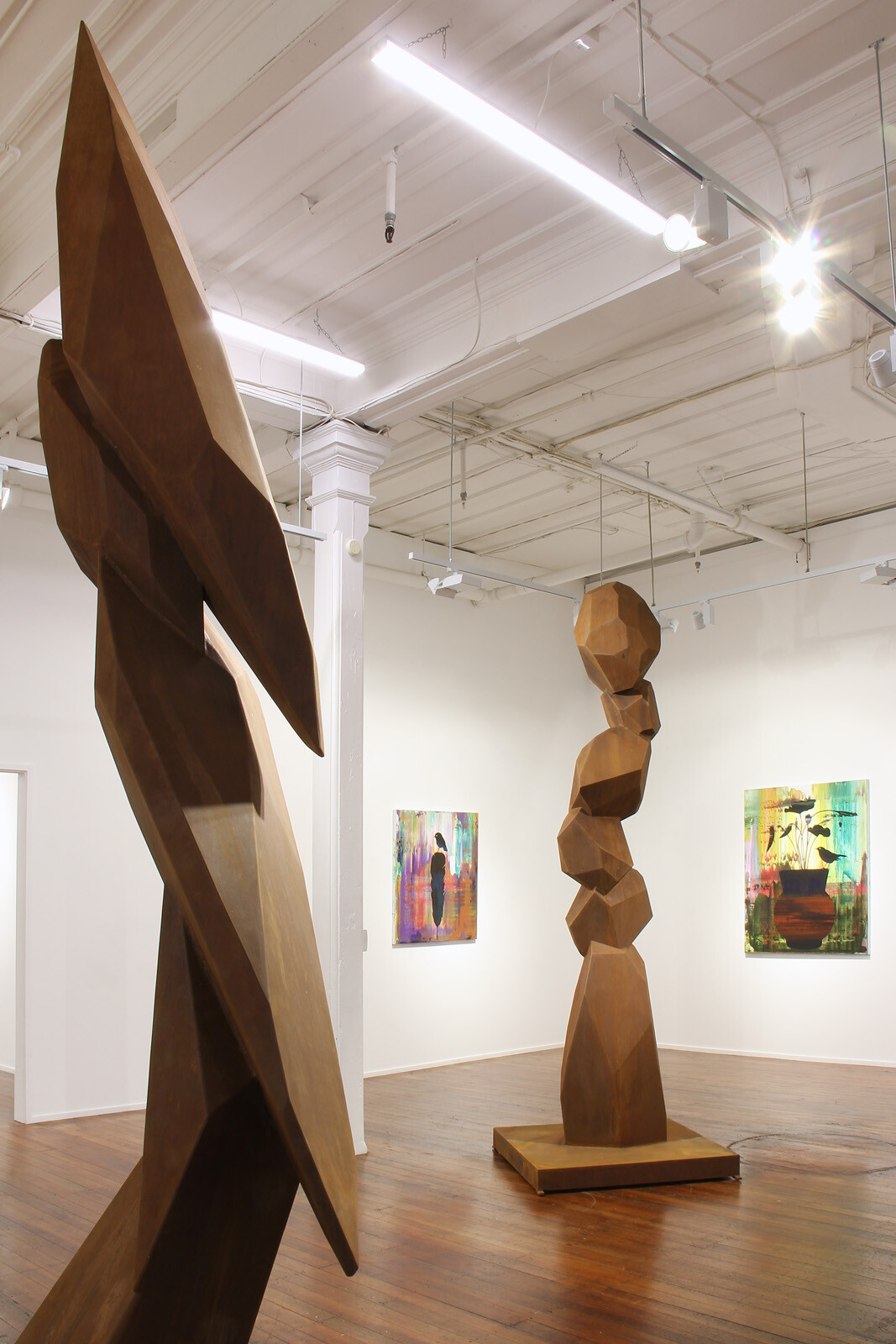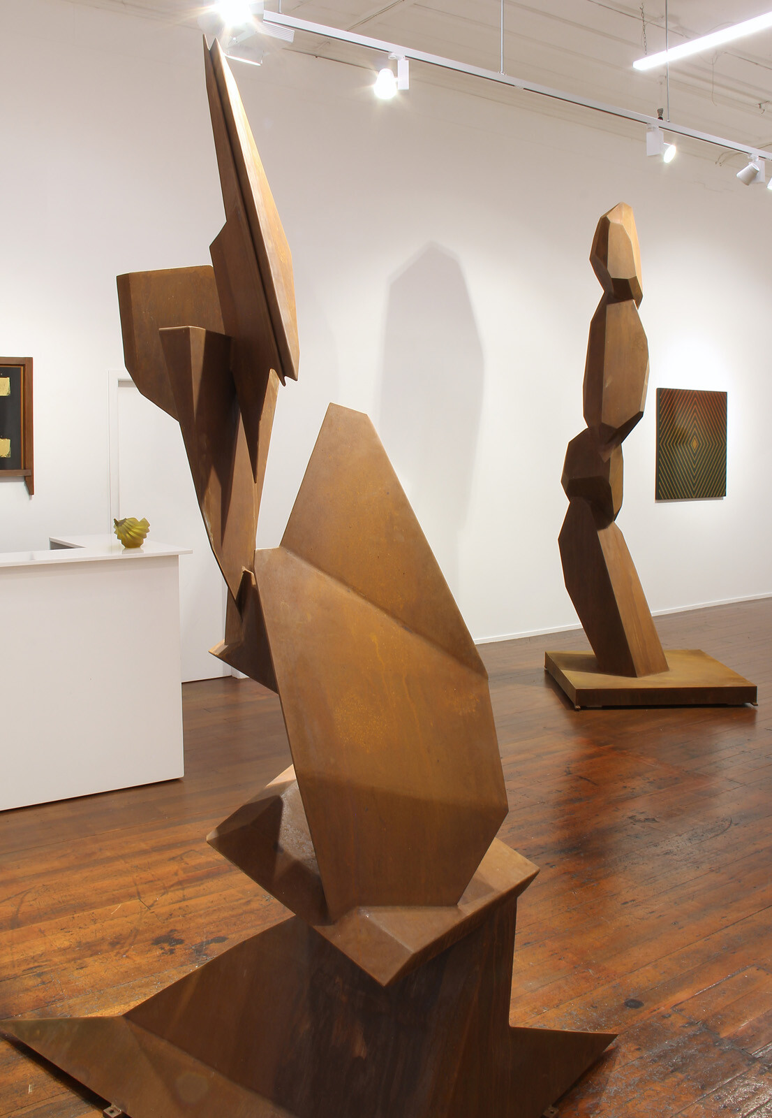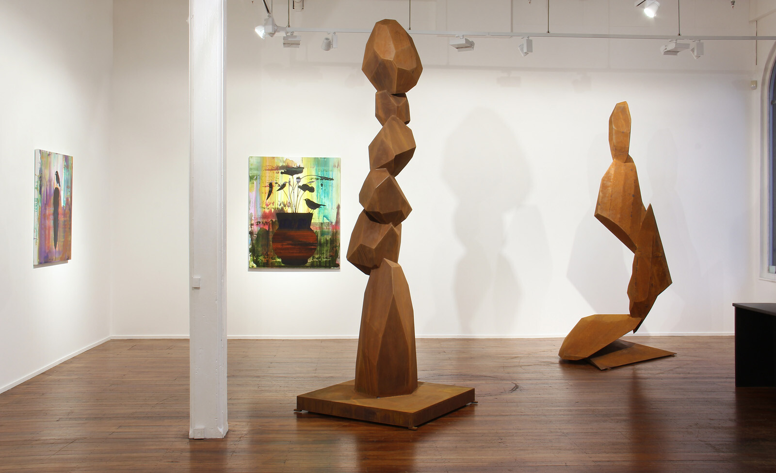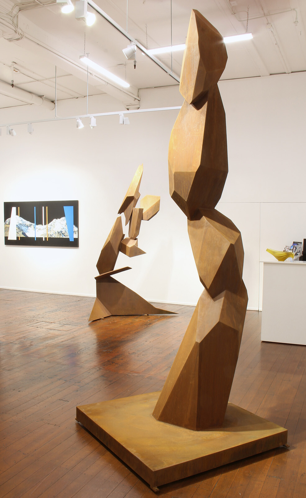 Ben Pearce's large-scale sculptures celebrate nature, its strength, and its delicate balance. The boulder-like sections of his towering forms seem tethered to the firmament yet soar into the air like the supports of some natural colonnade, the deep earthy sienna seeming to weep at the maltreatment of the environment. They seem to shift and turn as we move around them, giving them a sense of animated presence. Shapes and concepts emerge and disappear as the forms interact with the space around them.