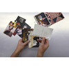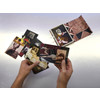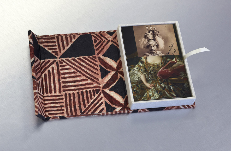 handmade paperboard box covered in siapo cloth containing 46 postcards with digital collage, postcards: 150 x 105 mm each