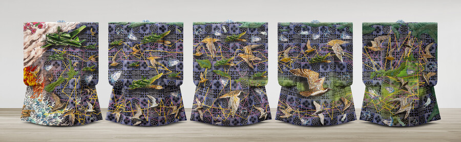 5 piece installation; Samoan siapo, textiles, felt, beads, plastic, kimonos: 1750 x 1410 x 250 mm each, installation dimensions variable