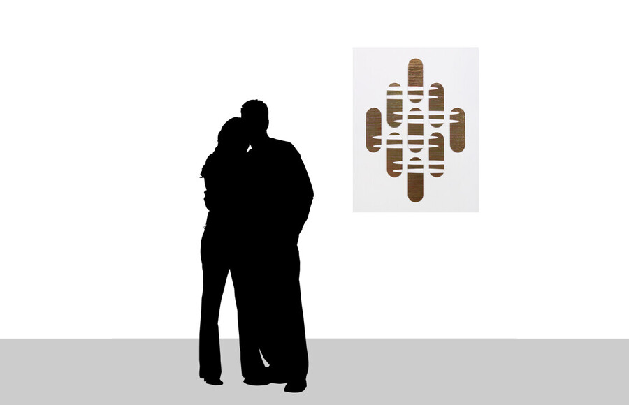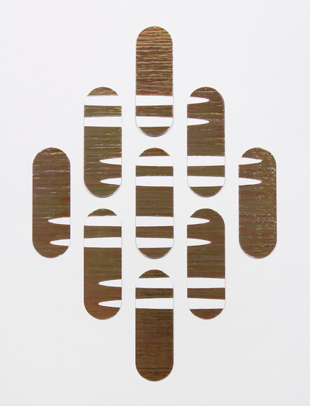 9 pieces; ink, acrylic, polymer resin on stainless steel, size on wall: 900 x 615 mm
