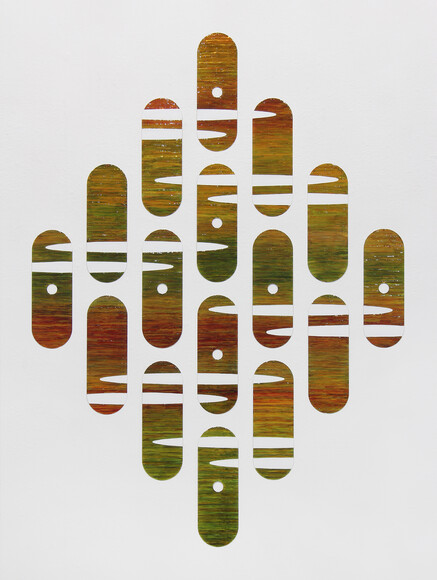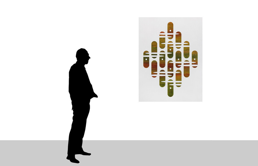 16 pieces; ink, acrylic, polymer resin on stainless steel, size on wall: 1205 x 875 mm