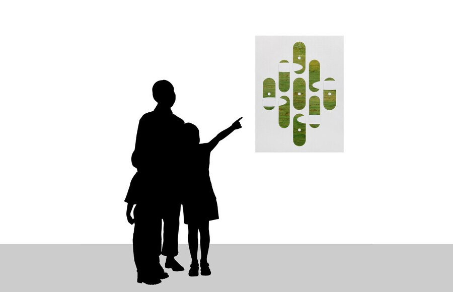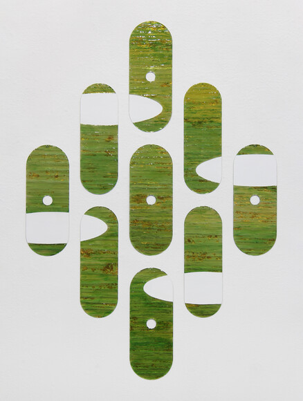 9 pieces; ink, acrylic, polymer resin on stainless steel, size on wall: 900 x 630 mm