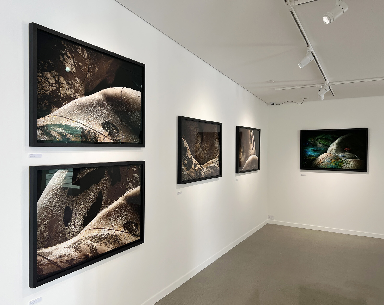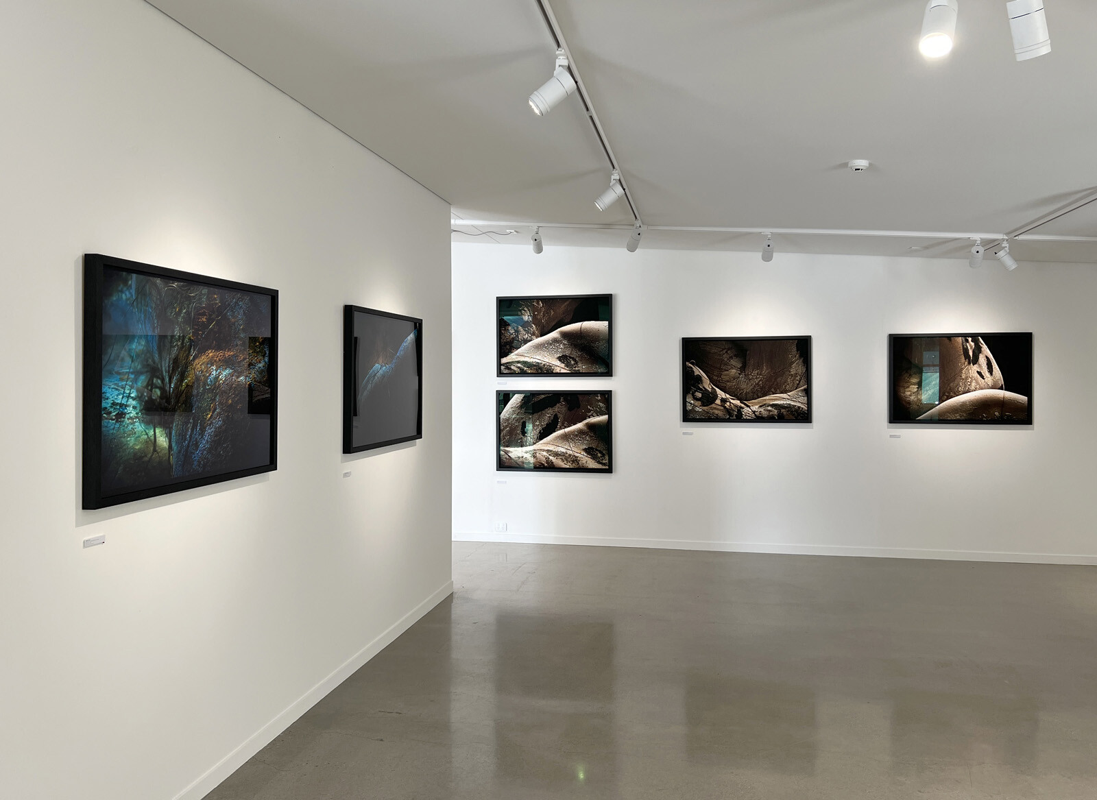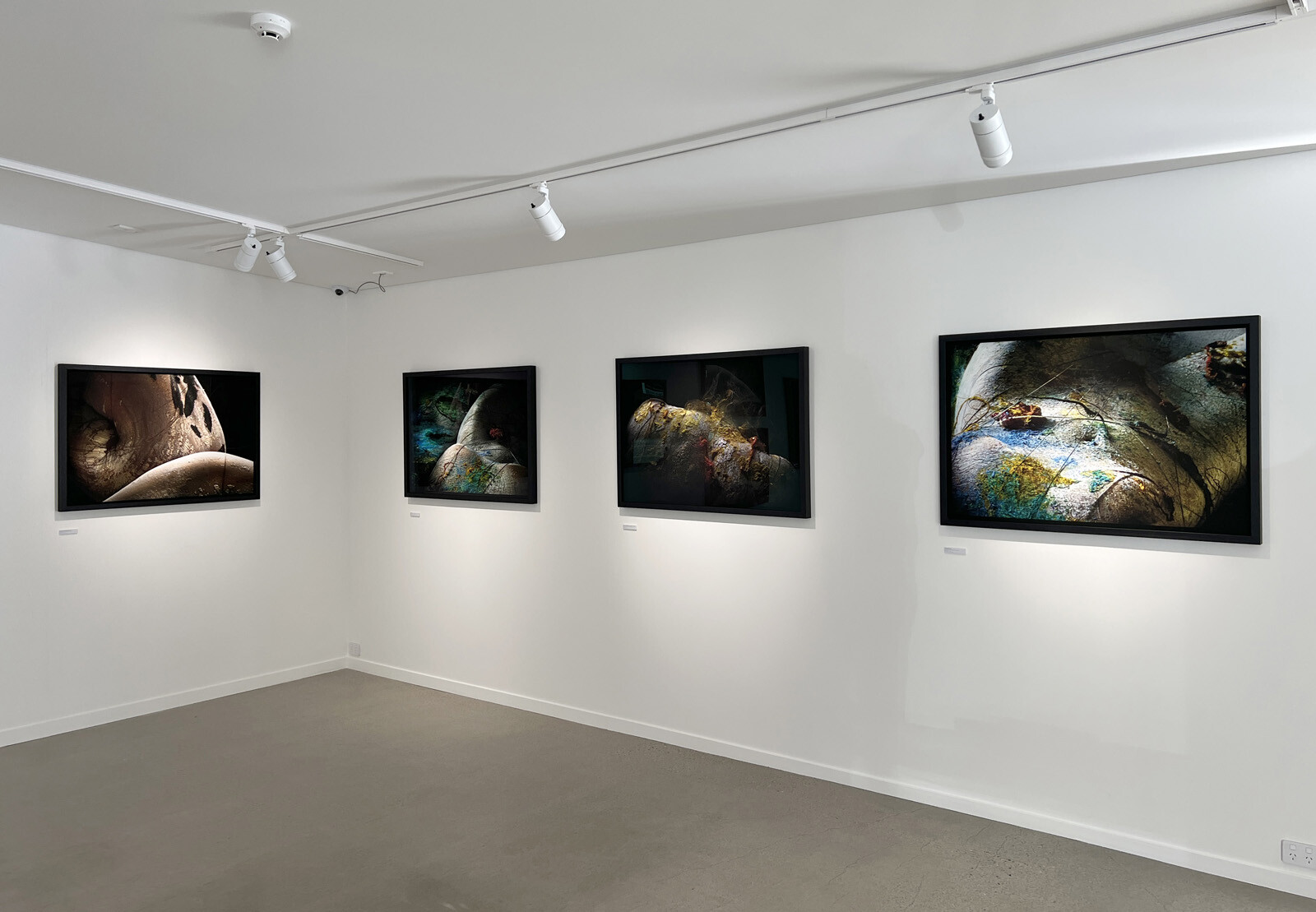 Ward draws heavily from his better-known career in film and cinematography for these works. We are presented with mesmerising vistas adrift in some haunting netherworld. In works such as Reef, the human form almost disappears into the submerged depths. Elsewhere, as in the connected images Dune and Summit – Chasm – Climax, the anatomy of the body is as evident as the dry, dusty land it represents. Analogies with creation myths are clear 3 - this is the Papatūānuku, the Gaia, the Mother Earth from whom we all sprang, and the pigments that consume the works are the tā moko which link us forever to the land through our mythic whakapapa.