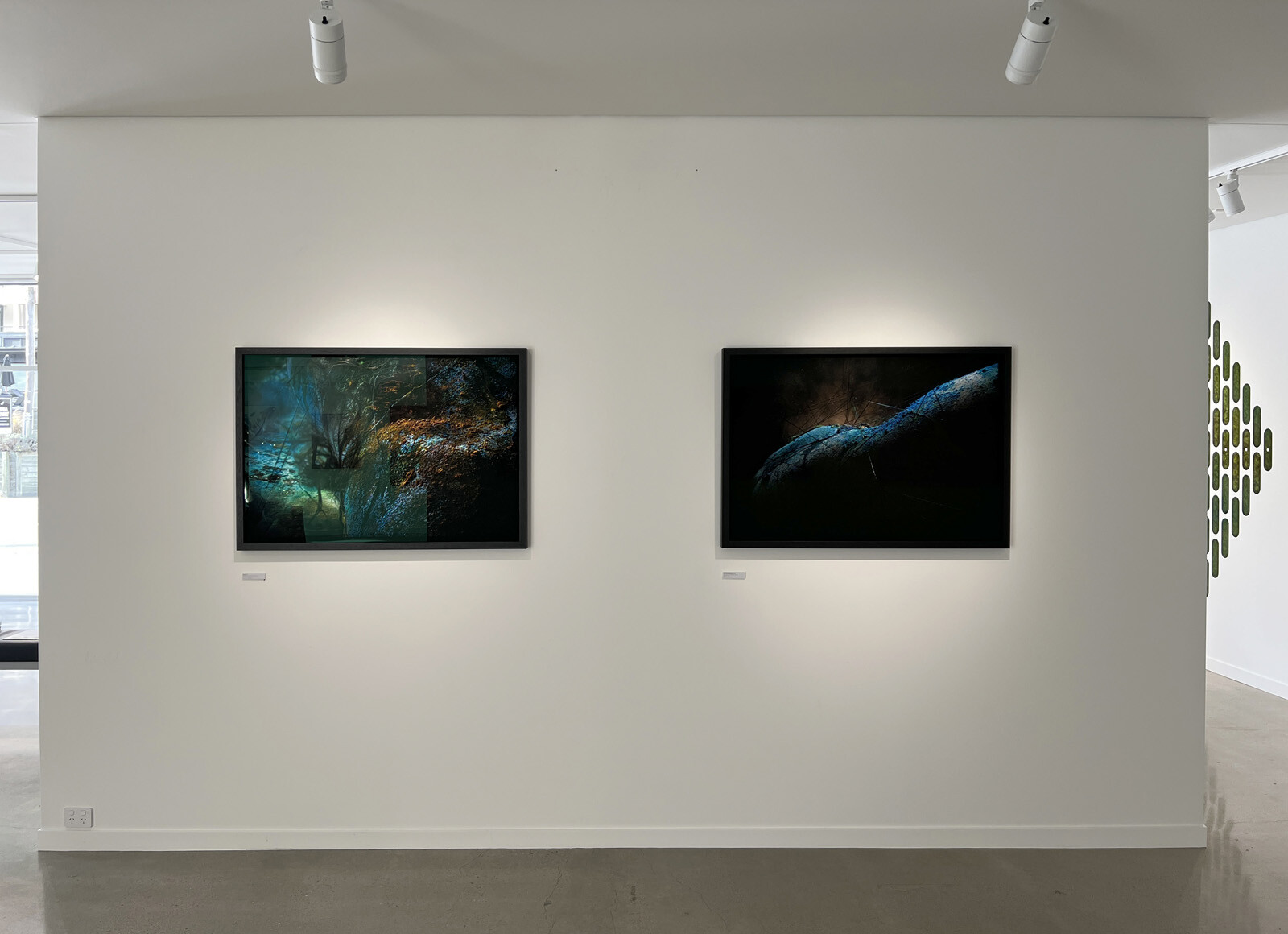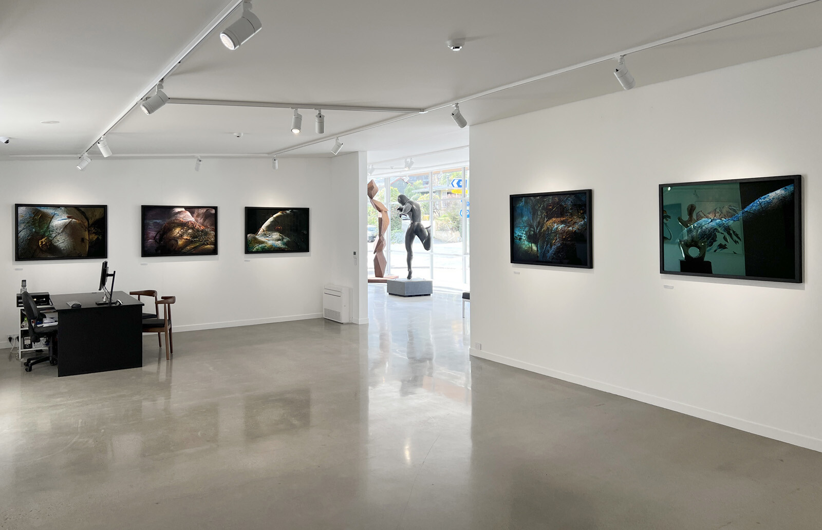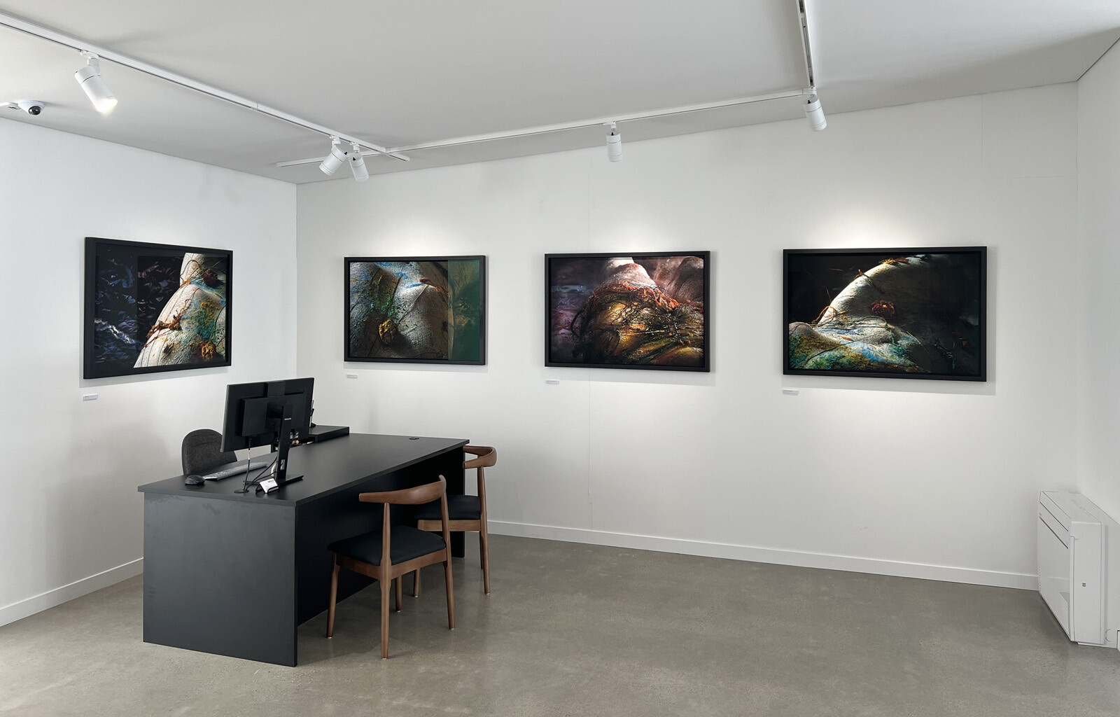 Ward draws heavily from his better-known career in film and cinematography for these works. We are presented with mesmerising vistas adrift in some haunting netherworld. In works such as Reef, the human form almost disappears into the submerged depths. Elsewhere, as in the connected images Dune and Summit – Chasm – Climax, the anatomy of the body is as evident as the dry, dusty land it represents. Analogies with creation myths are clear 3 - this is the Papatūānuku, the Gaia, the Mother Earth from whom we all sprang, and the pigments that consume the works are the tā moko which link us forever to the land through our mythic whakapapa.