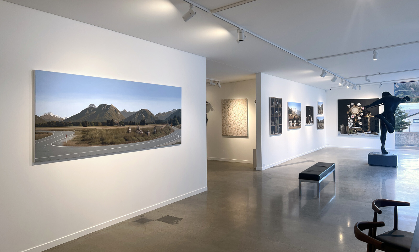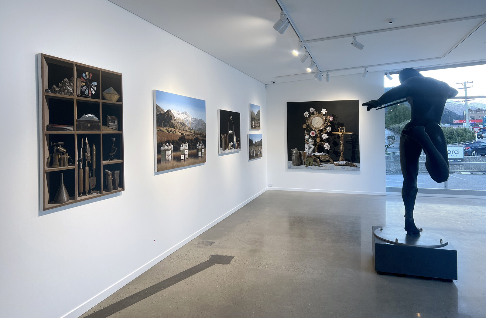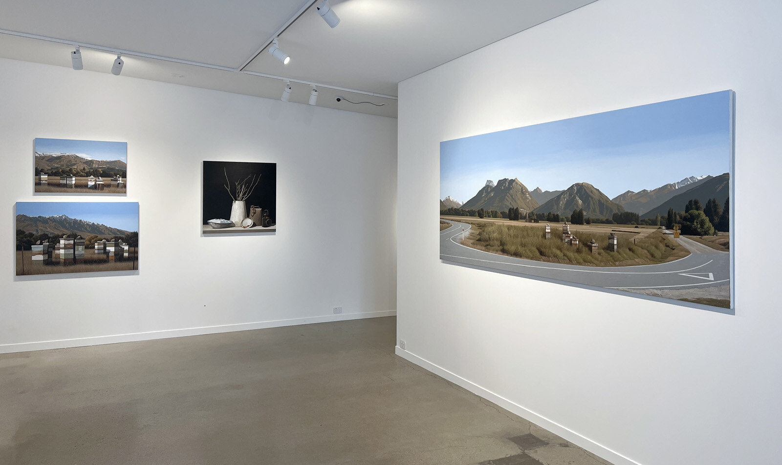Another thing shared by the two series is that they are highly successful exercises in painting the effects of light. In the Beehive works, the natural light of the day is filtered and softened where it hits the mountains by the haze of aerial perspective, shown to masterful effect in works such as Kinloch Rd and The Remarkables. In the case of the Nocturnes, the dark, Dutch master-like backdrops focus attention squarely on the highlighted objects occupying the shelves.