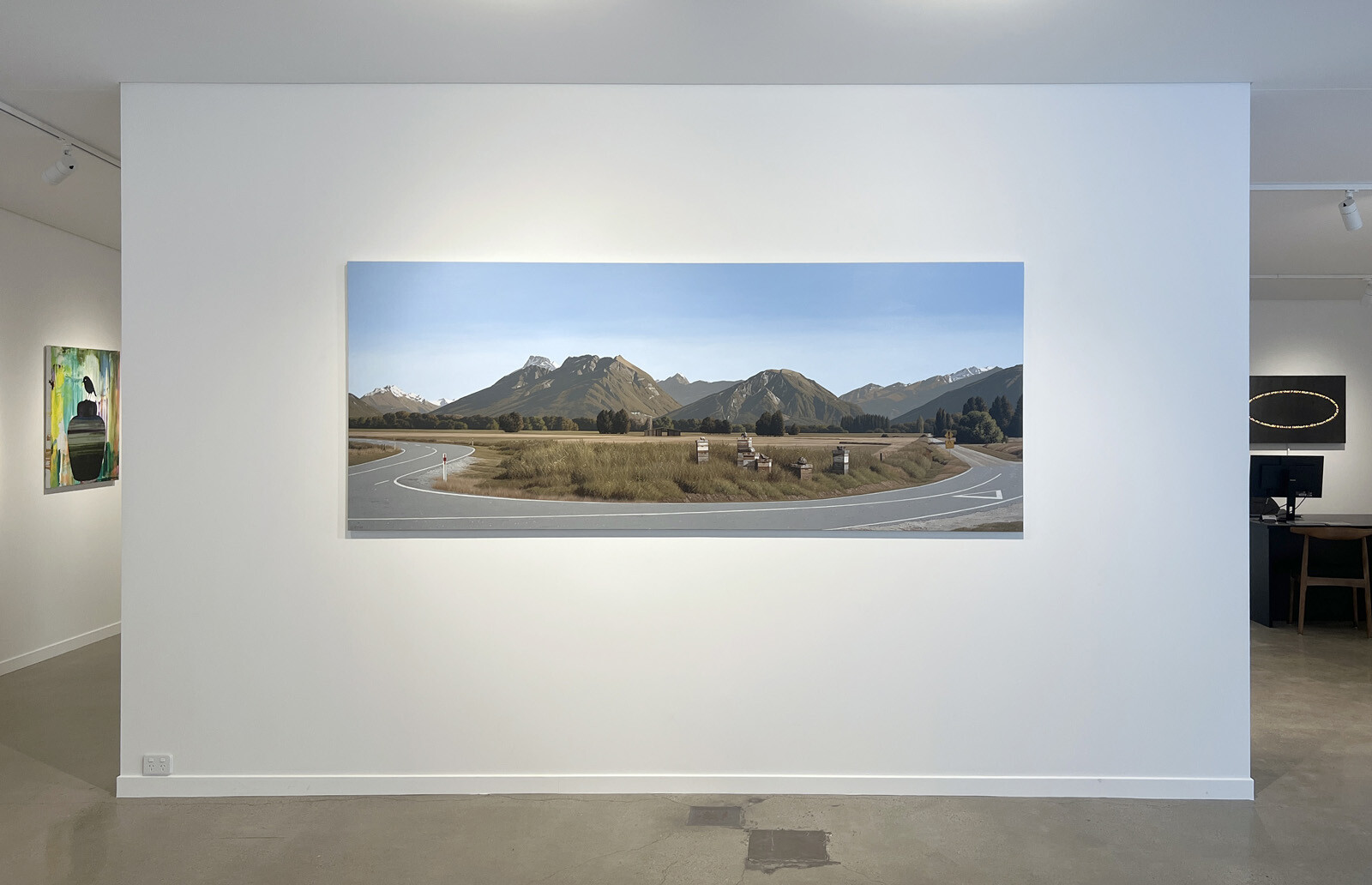 Perhaps the most audacious of the Beehive works in this latest selection is Rees Valley Road. Here, the roadway, often merely a peripheral feature of the paintings, becomes a sweeping asphalt river, restraining and framing the foreground beehives, which become almost subsidiary parts of the canvas. Attention is pulled to the old barn at the centre of the work, the eye drawn by the strong horizontal tree line and the diagonals of mountain slopes and the line of hives. Coupled with Hight's deft brushwork, this turns the work from a simple view of the Otago High Country into something compelling and grand.