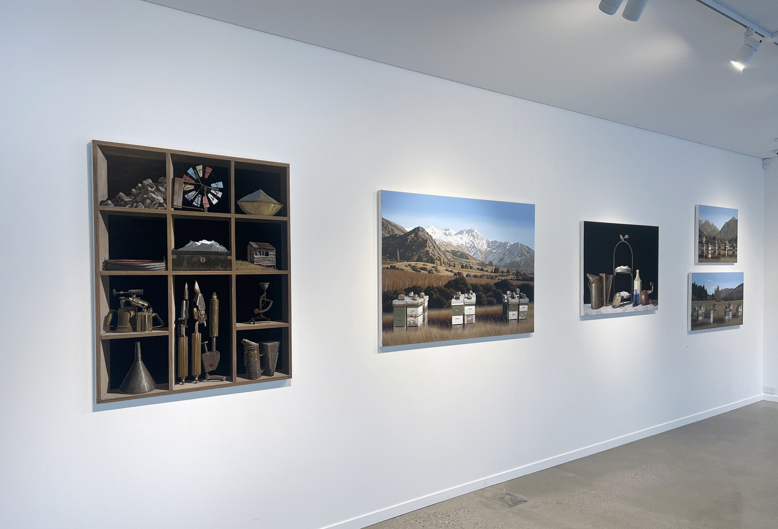 It is only when we see the two styles alongside each other that the works create dialogues which reveal the hidden similarities in their messages. Although seemingly disparate, both series speak of man's attempt to control nature. The beehives and farmed grasslands are evidence of human activity and the subjugation of one species and small areas of the countryside. Similarly, the contents of the shelves reflect human interaction with nature —most notably the small farm tools which form a major part in these paintings.