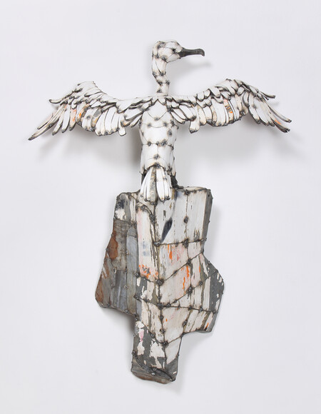 mild steel rod, corrugated iron, paint, size on wall: 1120 x 815 x 425 mm